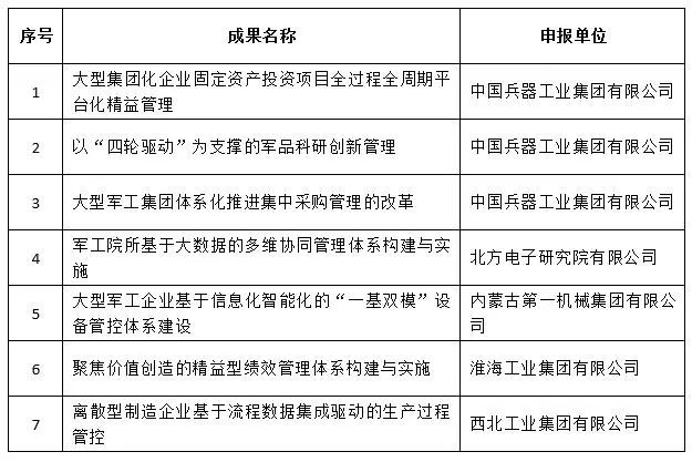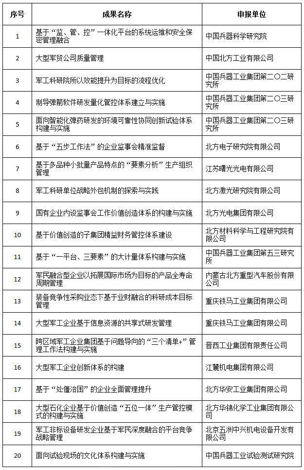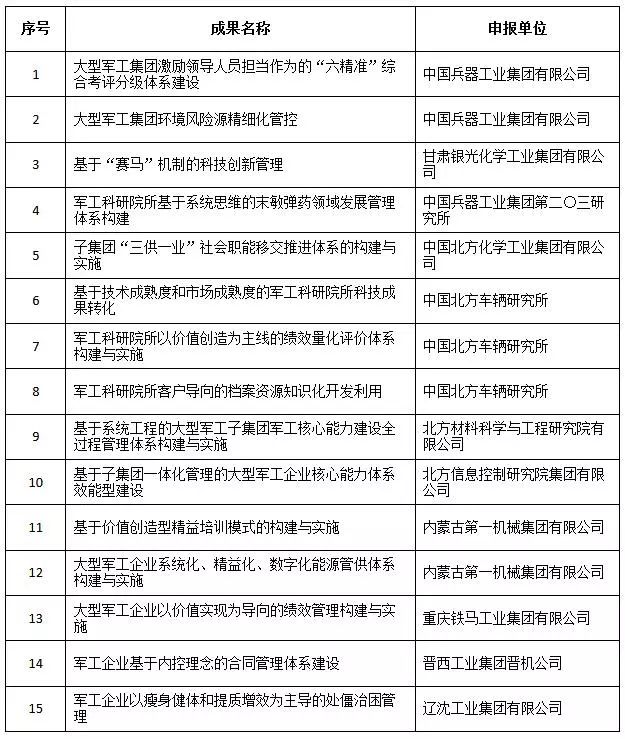 近日,中國兵器工業(yè)集團(tuán)4項創(chuàng)新成果獲全國企業(yè)管理現(xiàn)代化創(chuàng)新成果獎、42項創(chuàng)新成果獲國防科技工業(yè)企業(yè)管理創(chuàng)新成果獎。 全國企業(yè)管理現(xiàn)代化創(chuàng)新成果 經(jīng)全國企業(yè)管理現(xiàn)代化創(chuàng)新成果審定委員會終審,第二十五屆全國企業(yè)管理現(xiàn)代化創(chuàng)新成果公布,中國兵器工業(yè)集團(tuán)4項創(chuàng)新成果榮獲二等獎。 二等獎 國防科技工業(yè)企業(yè)管理創(chuàng)新成果 2018年度國防科技工業(yè)企業(yè)管理創(chuàng)新獲獎成果名單發(fā)布,中國兵器工業(yè)集團(tuán)共獲獎42項,其中:一等獎7項,二等獎15項,三等獎20項。獲獎總量及一等獎數(shù)量均位于軍工集團(tuán)首位。 一等獎 二等獎 三等獎 據(jù)悉,2018年度的國防科技工業(yè)企業(yè)管理創(chuàng)新評審工作,經(jīng)專家初審、函審、一等獎候選成果答辯、專家會議評審、評審委員會審核并公示后,評選出一批在履行強軍首責(zé)、全面貫徹創(chuàng)新驅(qū)動發(fā)展戰(zhàn)略和全面深化改革、高質(zhì)量發(fā)展等方面的優(yōu)秀成果。本年度共確定獲獎成果307項,其中一等獎44項,二等獎126項,三等獎137項。 |