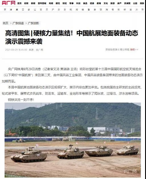 9月28日-10月3日,第十三屆中國(guó)國(guó)際航空航天博覽會(huì)在廣東珠海舉行,中國(guó)兵器工業(yè)集團(tuán)有限公司作為主辦單位閃耀亮相,推出裝甲突擊、火力打擊、智能彈藥、防空反導(dǎo)、無(wú)人裝備、非傳統(tǒng)安全、軍工軍技合作等領(lǐng)域新產(chǎn)品及成體系成建制武器系統(tǒng)和解決方案,全方位展示我國(guó)陸軍外貿(mào)武器裝備的最高水平以及雄厚的科技創(chuàng)新、自主研發(fā)與先進(jìn)制造能力,受到廣泛關(guān)注。 央視《新聞聯(lián)播》報(bào)道第十三屆中國(guó)航展,著重介紹了VT4主戰(zhàn)坦克,關(guān)注航展公眾日中國(guó)兵器館情況。9月28日下午央視《新聞直播間》航展特別節(jié)目《藍(lán)天盛會(huì)》邀請(qǐng)集團(tuán)公司訪談嘉賓做客直播間對(duì)中國(guó)兵器館兵器工業(yè)集團(tuán)展區(qū)等進(jìn)行1小時(shí)直播;9月28日下午、10月2日下午分別對(duì)地面裝備動(dòng)態(tài)表演進(jìn)行兩場(chǎng)直播。央視《朝聞天下》、《新聞直播間》、《共同關(guān)注》、《天下財(cái)經(jīng)》、《軍事報(bào)道》、《正午國(guó)防軍事》、《軍武零距離》等相繼推出集團(tuán)公司參展裝備的報(bào)道。