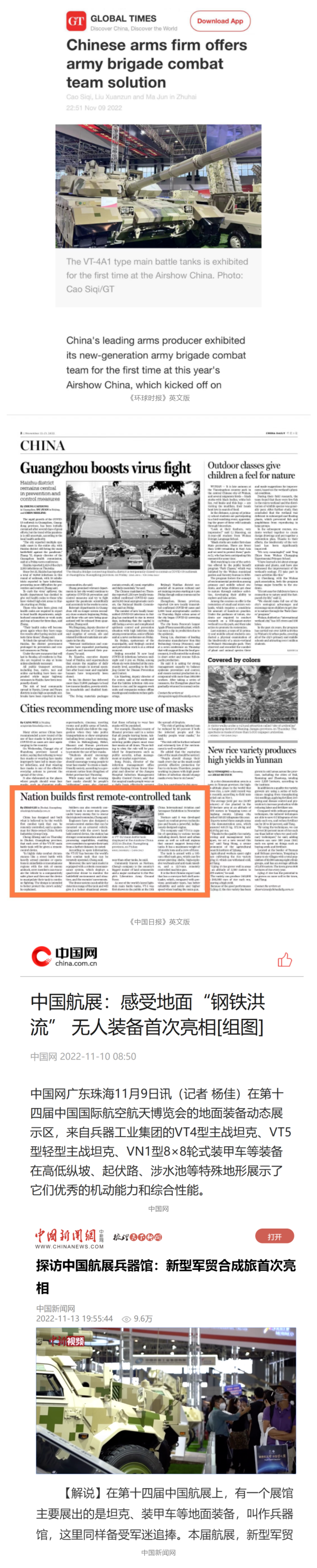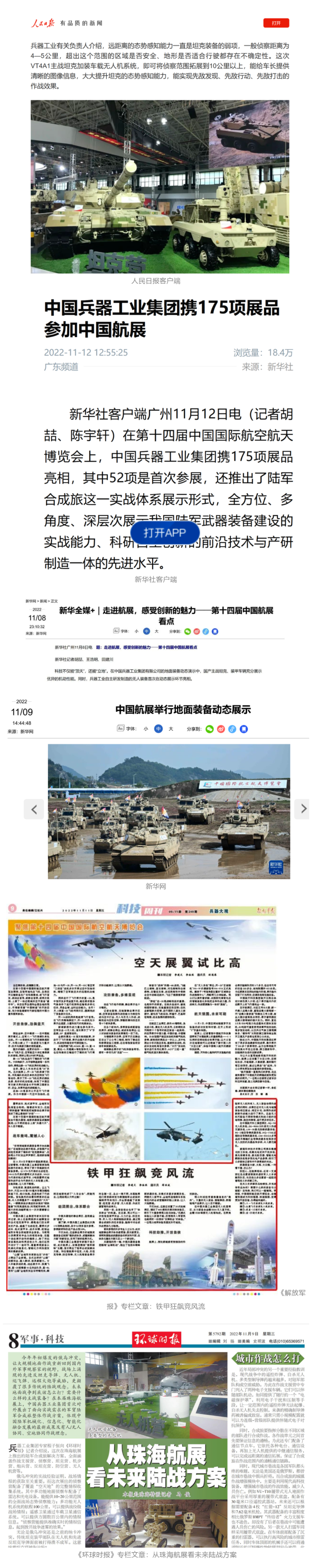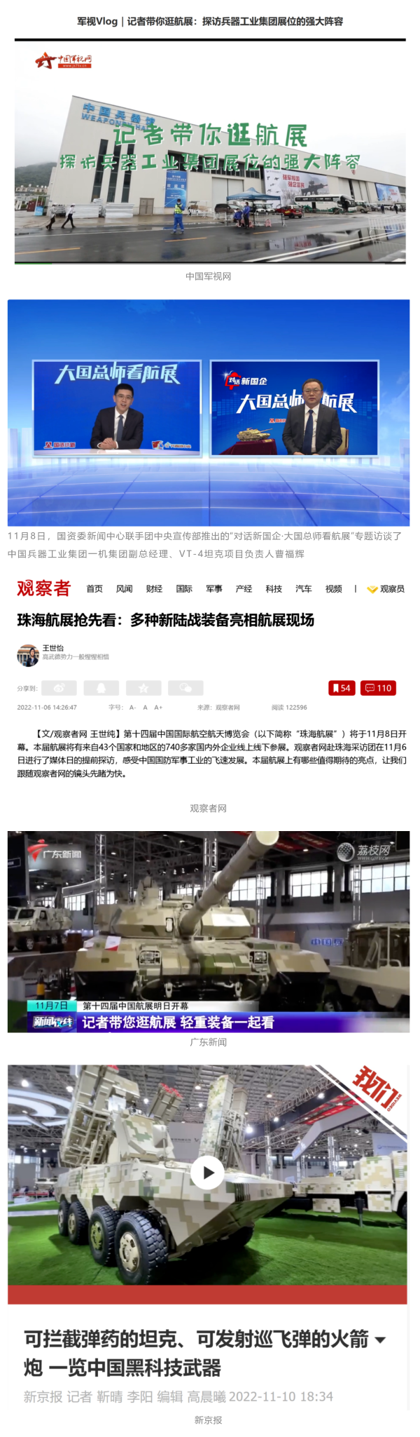 央視國防軍事頻道航展特別報(bào)道《炫舞天地間》11月12日《賞“鐵甲雄風(fēng)”!看航展地面裝備“鋼鐵洪流”名場面》對兵器工業(yè)集團(tuán)武器裝備特色亮點(diǎn)進(jìn)行報(bào)道?!秶儡娛略鐖?bào)》11月7日推出報(bào)道《第十四屆中國國際航空航天博覽會(huì)明天開幕 中國兵器館首次以陸軍合成旅實(shí)戰(zhàn)體系形式展出》,對兵器館陸軍合成旅實(shí)戰(zhàn)體系進(jìn)行報(bào)道?!盾娛聢?bào)道》11月9日推出《第十四屆中國國際航空航天博覽會(huì) 地面兵器裝備首次聯(lián)合陸航直升機(jī)進(jìn)行動(dòng)態(tài)展示》報(bào)道?!盾娒孕刑煜隆?1月9日推出報(bào)道《軍迷打卡航展2022》以專業(yè)軍迷視角探館兵器館,全面展示兵器工業(yè)集團(tuán)參展裝備特色亮點(diǎn)。