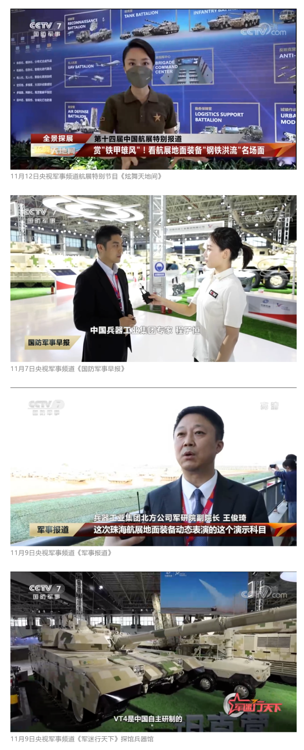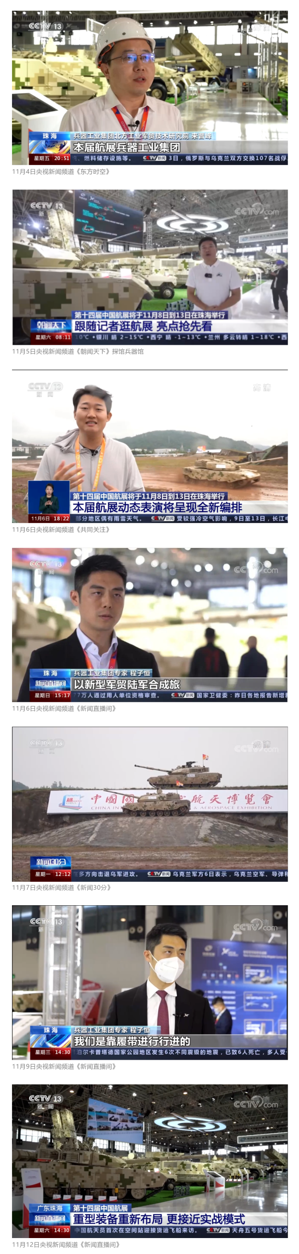 11月4日至12日,央視新聞?lì)l道播出《第十四屆中國航展將于11月8日到13日在珠海舉行 展品已就位 中國航展進(jìn)入倒計(jì)時(shí)》《第十四屆中國航展將于11月8日到13日在珠海舉行 全新布局 兵器館首次搭建實(shí)景指揮中心》《第十四屆中國航展將于11月8日到13日在珠海舉行 本屆航展動(dòng)態(tài)表演將呈現(xiàn)全新編排》《第十四屆中國航展 有人無人協(xié)同配合 打造新型火炮智能組合》《廣東珠海 第十四屆中國航展 功能新 亮點(diǎn)多 地面武器裝備集中亮相》《廣東珠海 第十四屆中國航展 一批高端裝備集中亮相》《廣東珠海 第十四屆中國航展 重型裝備重新布局 更接近實(shí)戰(zhàn)模式》等多篇新聞短片,對兵器工業(yè)集團(tuán)參展情況作了全方位專題報(bào)道。