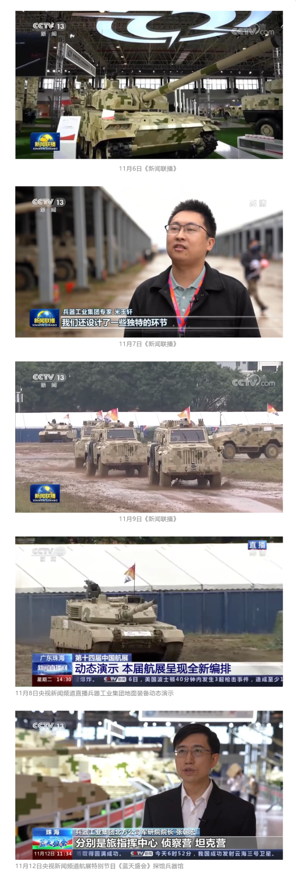 11月6日、7日、9日,央視《新聞聯(lián)播》三次報(bào)道兵器工業(yè)集團(tuán)參展情況,重點(diǎn)介紹了集團(tuán)公司總體參展情況、地面裝備動(dòng)態(tài)演示全新編排、國產(chǎn)輪式反伏擊車首次采用有人駕駛和無人駕駛混合編隊(duì)等內(nèi)容。11月8日,央視新聞?lì)l道直播地面裝備動(dòng)態(tài)演示;11月12日,央視新聞?lì)l道航展特別報(bào)道《藍(lán)天盛會(huì)》探訪兵器館,采訪兵器工業(yè)集團(tuán)嘉賓對陸軍合成旅作了報(bào)道。
