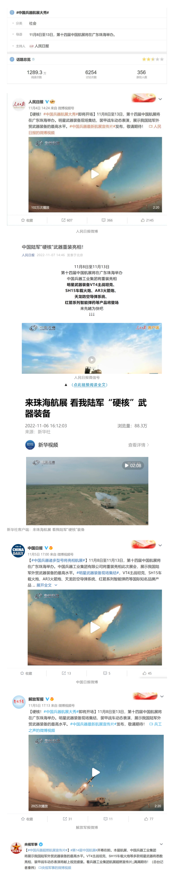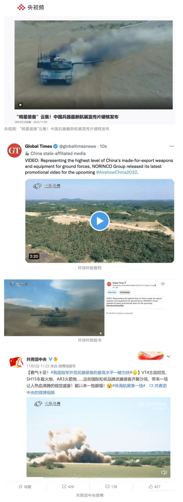 人民日報(bào)官方微博、微信公眾號(hào),新華社客戶端、央視新聞客戶端、中國日報(bào)微博、參考消息微信公眾號(hào)、解放軍報(bào)微博、央視軍事微博、CGTN微博、中國軍號(hào)微博、共青團(tuán)中央微博、環(huán)球時(shí)報(bào)(英文網(wǎng)站、臉書賬號(hào)、推特賬號(hào))、嗶哩嗶哩、學(xué)習(xí)強(qiáng)國平臺(tái)、國資小新視頻號(hào)、網(wǎng)易軍事、騰訊軍事、鳳凰軍事、北京日報(bào)、東方衛(wèi)視看看新聞全媒體、北京電視臺(tái)等20余家中央主流媒體、國家部委、省市媒體的新媒體第一時(shí)間播發(fā)集團(tuán)公司航展宣傳片等視頻作品燃爆全網(wǎng),累計(jì)閱讀量突破1700萬人次。集團(tuán)公司微信公眾號(hào)、微博、抖音號(hào)、快手號(hào)、微信視頻號(hào)、知乎號(hào)等新媒體宣傳片播放閱讀量超過800萬人次,點(diǎn)贊超過30萬人次。集團(tuán)公司微信公眾號(hào)推出《硬核!中國兵器最新航展宣傳片發(fā)布》《中國兵器航展節(jié)目單,請選出心中明星裝備》《航展首日,中國兵器閃耀亮相!》等7篇報(bào)道,閱讀量超過25萬人次,集團(tuán)公司微信視頻號(hào)、抖音號(hào)、快手號(hào)等新媒體賬號(hào)發(fā)布“中國兵器航展大秀”系列視頻,觀看量超過330萬人次。