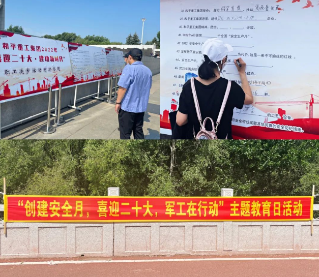 和平重工集團在安全生產(chǎn)月期間組織開展了“創(chuàng)建安全月 喜迎二十大 軍工在行動”主題教育日活動,現(xiàn)場懸掛宣傳橫幅標語,工作人員為職工們發(fā)放安全知識宣傳冊、扇子等宣傳用品,并在現(xiàn)場組織了安全知識有獎答題環(huán)節(jié),調(diào)動廣大職工參與的積極性,大力營造了“關愛生命、關注安全”的良好氛圍。