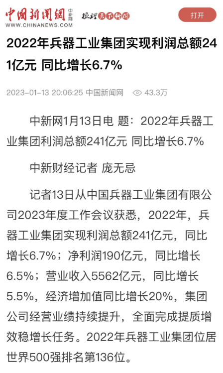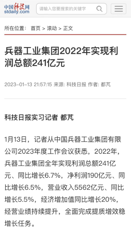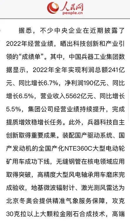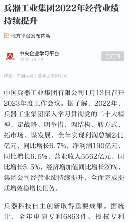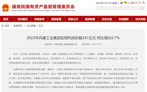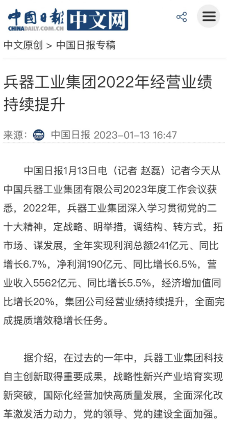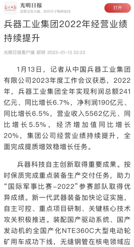 1月13日,中國兵器工業(yè)集團有限公司召開2023年度工作會議,傳達學習中央領(lǐng)導(dǎo)同志、軍方首長和上級部門重要批示,總結(jié)集團公司2022年工作,研究部署2023年主要工作任務(wù)。 集團公司2022年重點工作取得的成績及下一步的改革發(fā)展受到社會媒體廣泛關(guān)注。新華社、新華財經(jīng)、人民網(wǎng)、經(jīng)濟日報客戶端、光明日報客戶端、中國日報網(wǎng)、中國科技網(wǎng)、中國新聞網(wǎng)、央廣網(wǎng)、國資委網(wǎng)站、學習強國中央企業(yè)學習平臺、新浪網(wǎng)、騰訊網(wǎng)、搜狐網(wǎng)、網(wǎng)易網(wǎng)、今日頭條等中央主流媒體、國家部委網(wǎng)站及知名網(wǎng)絡(luò)媒體對集團公司工作會議進行了報道,重點關(guān)注集團公司高質(zhì)量發(fā)展、科技創(chuàng)新、戰(zhàn)略性新興產(chǎn)業(yè)培育、深化改革、國際化經(jīng)營、履行央企社會責任等內(nèi)容。其中新華社以《北斗時空智能服務(wù)平臺累計服務(wù)終端數(shù)突破15億》為題,重點報道了集團公司2022年在自主創(chuàng)新、戰(zhàn)略新興產(chǎn)業(yè)培育、專利申請等方面取得的成績;經(jīng)濟日報客戶端、光明日報客戶端、中國日報網(wǎng)等以《兵器工業(yè)集團2022年經(jīng)營業(yè)績持續(xù)提升》為題,重點報道了集團公司在高質(zhì)量發(fā)展、全面完成提質(zhì)增效穩(wěn)增長方面取得的成績。集團公司門戶網(wǎng)站、微信公眾號、微博等新媒體也對集團公司工作會議進行了及時報道,各成員單位紛紛對相關(guān)內(nèi)容進行轉(zhuǎn)載,引發(fā)全系統(tǒng)關(guān)注。 新華社:北斗時空智能服務(wù)平臺累計服務(wù)終端數(shù)突破15億 新華財經(jīng):兵器工業(yè)集團2022年實現(xiàn)凈利潤190億元 同比增長6.5% 人民網(wǎng):2022年中央企業(yè)營收同比增長8.3% 科技創(chuàng)新成效顯著 經(jīng)濟日報客戶端:兵器工業(yè)集團2022年經(jīng)營業(yè)績持續(xù)提升 光明日報客戶端:兵器工業(yè)集團2022年經(jīng)營業(yè)績持續(xù)提升 中國日報網(wǎng):兵器工業(yè)集團2022年經(jīng)營業(yè)績持續(xù)提升 中國科技網(wǎng):兵器工業(yè)集團2022年實現(xiàn)利潤總額241億元 中國新聞網(wǎng):2022年兵器工業(yè)集團實現(xiàn)利潤總額241億元 同比增長6.7% 國資委網(wǎng)站:2022年兵器工業(yè)集團實現(xiàn)利潤總額241億元 同比增長6.7% 學習強國中央企業(yè)學習平臺:兵器工業(yè)集團2022年經(jīng)營業(yè)績持續(xù)提升 集團公司職工及廣大網(wǎng)友熱議工作會議 “這次會議全面總結(jié)了2022年工作,深入分析研判當前形勢,部署2023年重點工作,為我們做好2023年及今后一個時期的工作明確了目標、堅定了信心?!?/p> “作為兵工人,我要苦練內(nèi)功、不懼挑戰(zhàn)、奮勇向前,為建設(shè)具有全球競爭力的世界一流集團公司貢獻自己的力量?!?/p> “聚焦高科技領(lǐng)域,制造更多的大國重器,讓更多的產(chǎn)品服務(wù)老百姓。” “在不平凡的2022年取得了亮眼的工作成績,為兵器工業(yè)點贊?!?/p> “希望能有更多新型武器裝備部隊,2023年,望你們再創(chuàng)輝煌,加油!” |