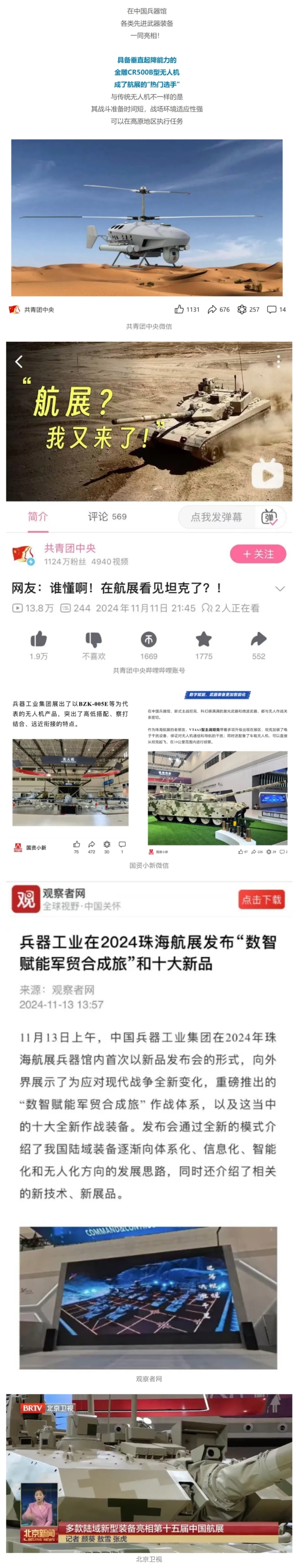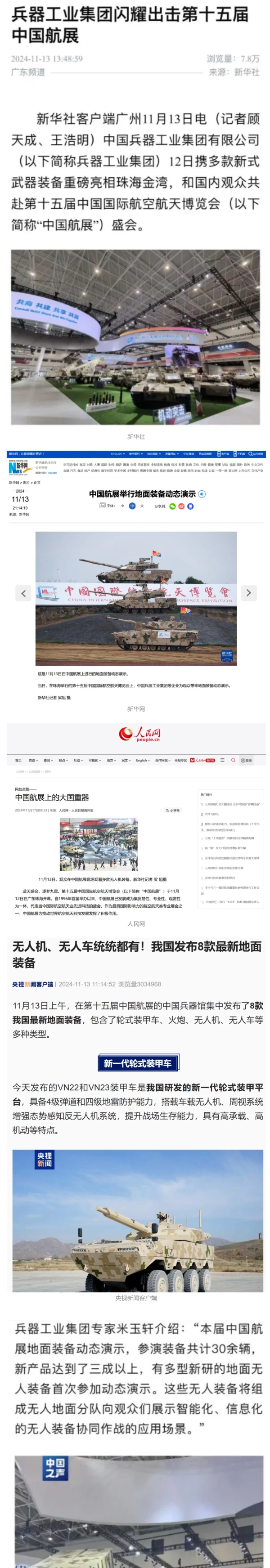 11月12日至17日,第十五屆中國(guó)國(guó)際航空航天博覽會(huì)在廣東省珠海市舉行,中國(guó)兵器工業(yè)集團(tuán)有限公司突出數(shù)智賦能軍貿(mào)合成旅作戰(zhàn)體系,帶來(lái)了一系列新產(chǎn)品、新技術(shù)、新體系,全方位展示我國(guó)陸軍外貿(mào)武器裝備發(fā)展最高水平、最新突破、最前沿成果,立體化呈現(xiàn)陸域信息化、智能化、體系化作戰(zhàn)能力,受到了全社會(huì)廣泛關(guān)注。航展期間,央視綜合頻道《新聞聯(lián)播》、央視新聞?lì)l道《新聞直播間》《長(zhǎng)空鵬程》報(bào)道兵器工業(yè)集團(tuán)參展情況,重點(diǎn)介紹了VT4A1主戰(zhàn)坦克、輪式裝甲火炮、新一代陸域指控信息系統(tǒng)、無(wú)人戰(zhàn)車、民用無(wú)人運(yùn)輸機(jī)及地面裝備演示有關(guān)內(nèi)容。央視新聞推出航展直播節(jié)目《藍(lán)天之約》,邀請(qǐng)兵器工業(yè)集團(tuán)嘉賓對(duì)參展情況、裝備動(dòng)態(tài)演示作了講解。