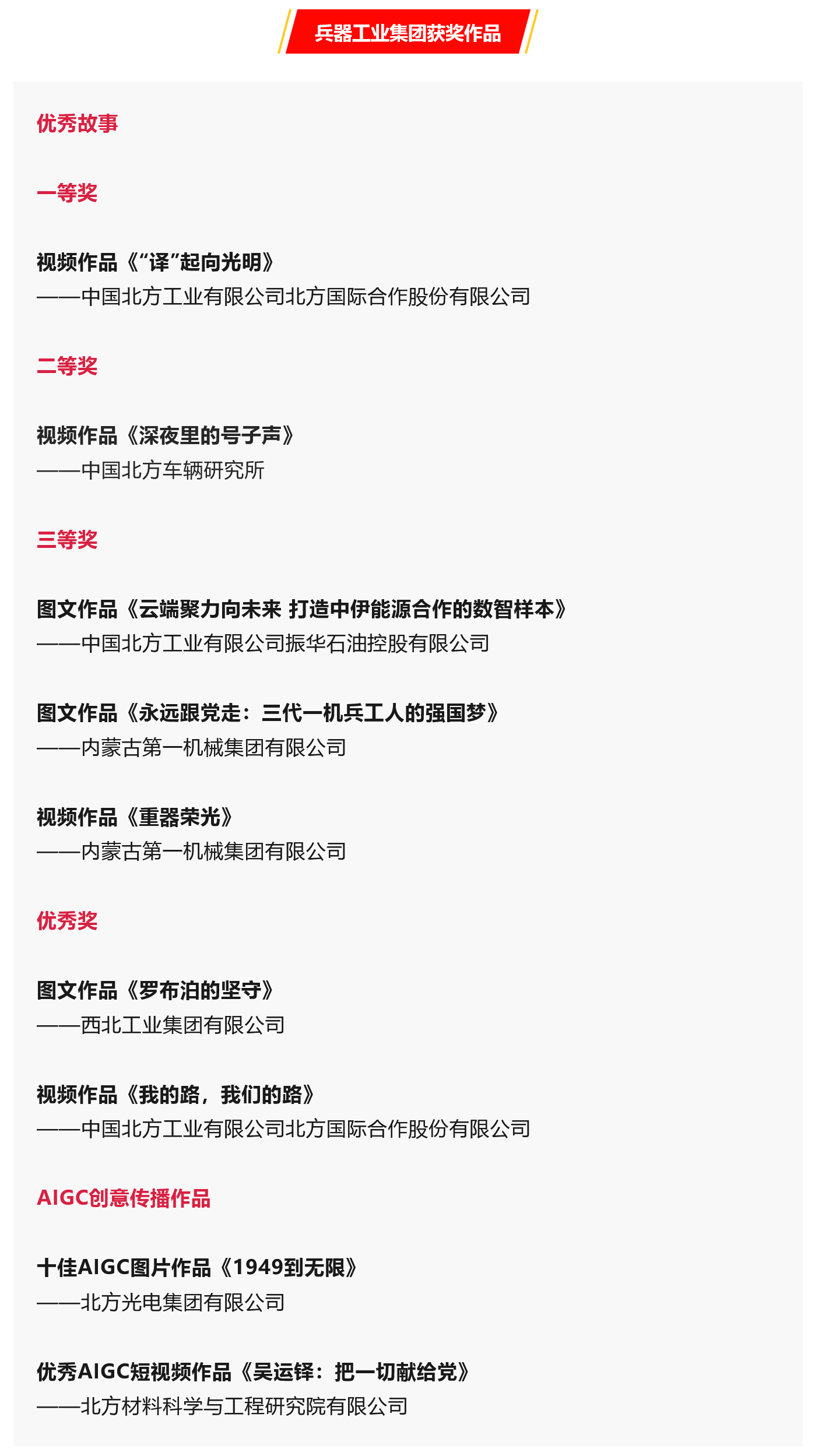 12月3日,由國務(wù)院國資委宣傳局、人民網(wǎng)聯(lián)合主辦的“砥礪七十五載 譜寫央企擔(dān)當(dāng)”第七屆中央企業(yè)優(yōu)秀故事暨AIGC創(chuàng)意傳播作品發(fā)布展示活動(dòng)在京舉行,中國兵器工業(yè)集團(tuán)有限公司共有9件作品獲獎(jiǎng),其中,優(yōu)秀故事一等獎(jiǎng)1項(xiàng)、二等獎(jiǎng)1項(xiàng)、三等獎(jiǎng)3項(xiàng)、優(yōu)秀獎(jiǎng)2項(xiàng),十佳AIGC圖片作品1項(xiàng)、優(yōu)秀AIGC短視頻作品1項(xiàng)。