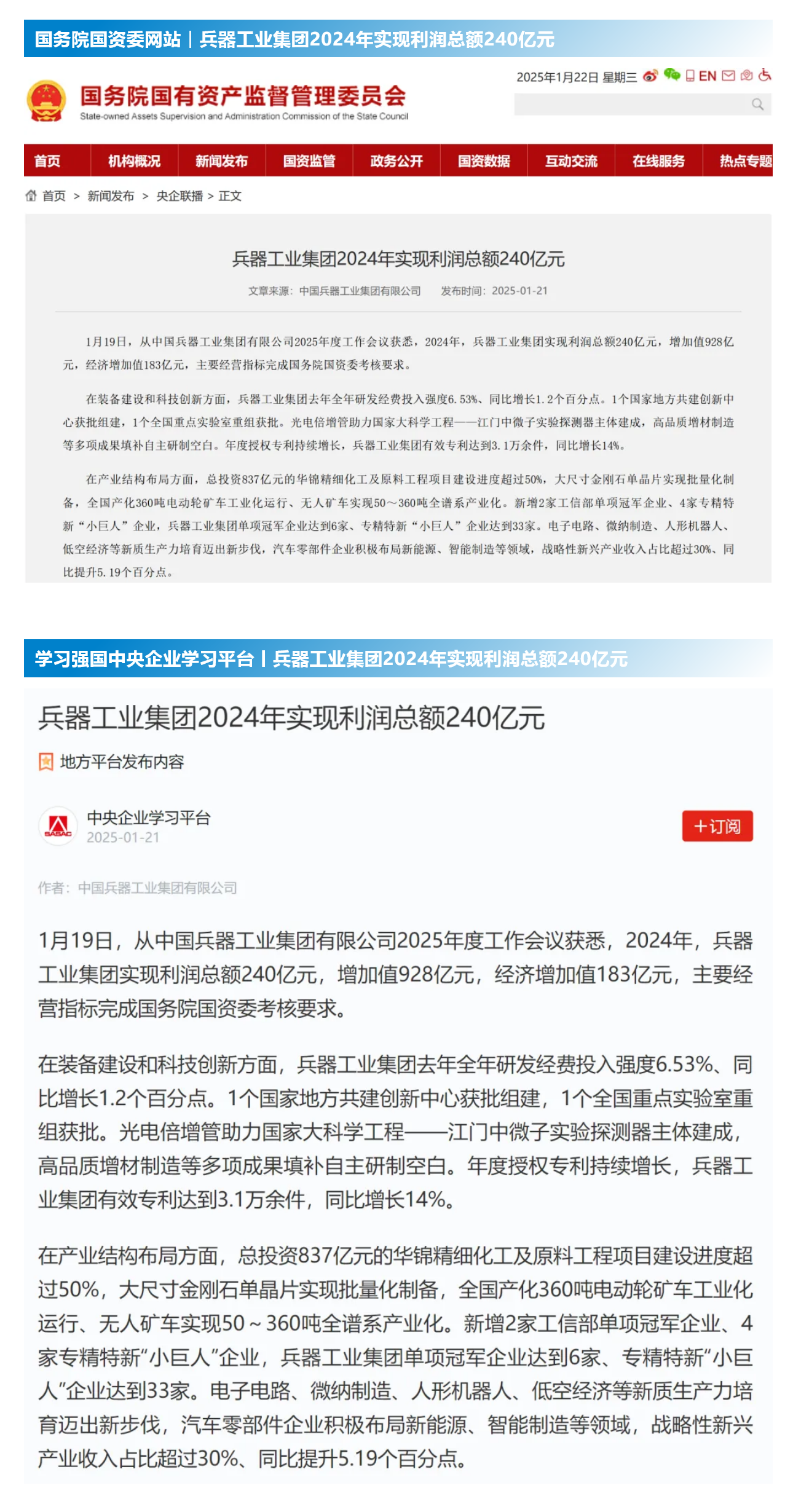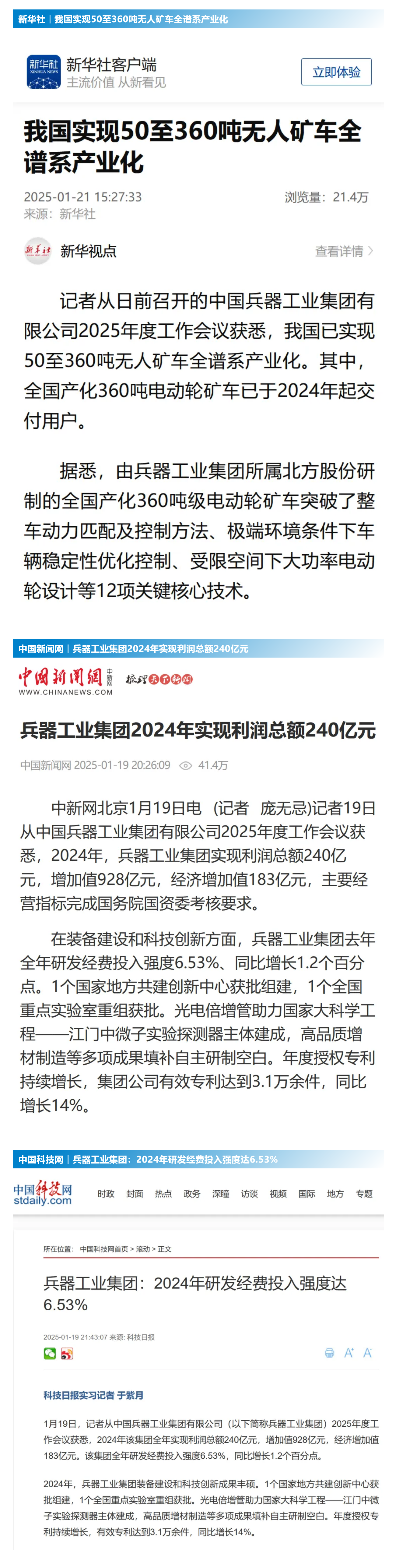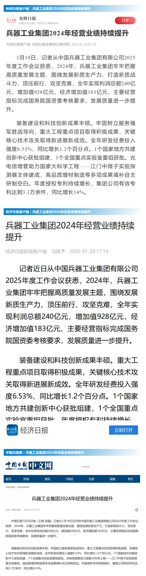 1月19日至20日,中國兵器工業(yè)集團有限公司2025年度工作會議在京召開,會議總結(jié)2024年工作,分析形勢任務,明確工作思路,部署2025年工作。 集團公司2024年取得的成績及下一步重點工作受到社會媒體廣泛關注。新華社、中國新聞網(wǎng)、中國科技網(wǎng)、光明日報客戶端、經(jīng)濟日報客戶端、中國日報網(wǎng)、國務院國資委網(wǎng)站、學習強國中央企業(yè)學習平臺、新浪網(wǎng)、網(wǎng)易網(wǎng)、搜狐網(wǎng)、騰訊網(wǎng)、鳳凰網(wǎng)等中央主流媒體、國家部委網(wǎng)站及知名網(wǎng)絡媒體對集團公司2025年度工作會議進行了報道,重點關注集團公司經(jīng)營業(yè)績、科技創(chuàng)新、產(chǎn)業(yè)結(jié)構(gòu)布局優(yōu)化等情況。其中,新華社以《我國實現(xiàn)50至360噸無人礦車全譜系產(chǎn)業(yè)化》為題,重點報道了集團公司在推動智能制造水平提升方面取得的成效;中國新聞網(wǎng)、光明日報客戶端、經(jīng)濟日報客戶端、中國日報網(wǎng)等就集團公司2024年度經(jīng)營業(yè)績及各項工作取得的成果進行報道;中國科技網(wǎng)著重報道了集團公司在科技創(chuàng)新和優(yōu)化產(chǎn)業(yè)結(jié)構(gòu)布局方面的最新進展。集團公司門戶網(wǎng)站、微信公眾號、微博等新媒體平臺以及《中國兵工報》也對集團公司工作會議進行了及時報道,各成員單位紛紛對相關內(nèi)容進行轉(zhuǎn)載,引發(fā)全系統(tǒng)關注。 集團公司職工及廣大網(wǎng)友熱議工作會 “2025年工作會為我們指明了發(fā)展方向、明確了奮斗目標,面對全新的機遇和挑戰(zhàn),作為兵工人深感責任重大?!?/p> “科技是第一生產(chǎn)力,一定要以科技創(chuàng)新引領新質(zhì)生產(chǎn)力發(fā)展,為高質(zhì)量發(fā)展提供支撐?!?/p> “把各項工作做深、做實、做細,努力為集團公司高質(zhì)量發(fā)展添磚加瓦?!?/p> “2024年中國兵器展示了大國重器,祝新的一年中再創(chuàng)輝煌!” |